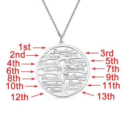 The word family splits each word to mean Father and Mother I love you, this family tree necklace can be customized with 1-12 names, the tree is equal to our mother, engrave our names on the branches, representing With our love for Father and Mother.